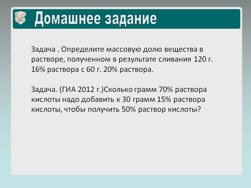 1. Задача. Определите массовую долю вещества в растворе, полученном в результате сливания 120 г. 16% раствора с 60 г. 20% раствора.