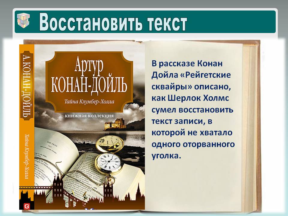 Учитель химии. В рассказе Конан Дойля «Рейгетские сквайры» описано, как Холмс сумел восстановить текст записи, в которой не хватало одного оторванного уголка.