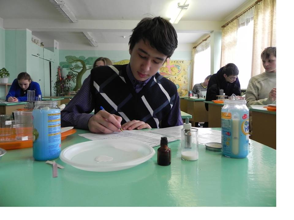 Учитель химии: Молоко – это скоропортящийся продукт, поэтому особое внимание обращают на фальсификацию молока. Кроме воды в молоко подмешивают крахмал, мел, мыло, соду, известь, борную или салициловую кислоту и даже гипс.