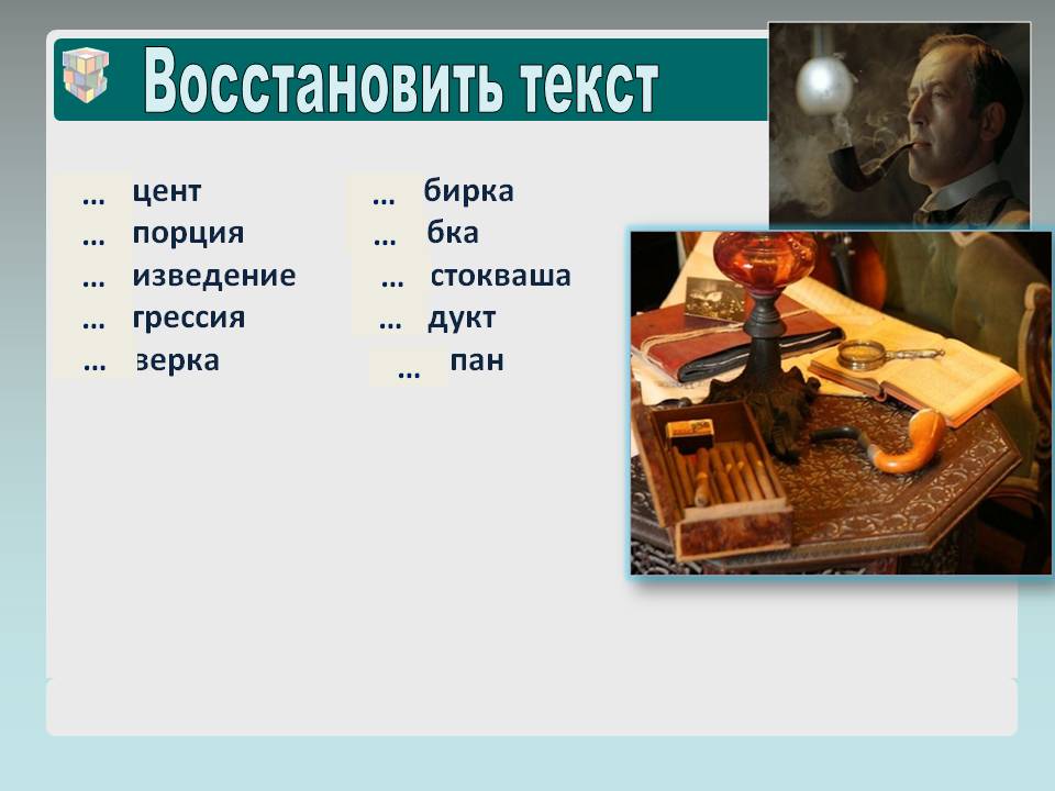Учитель математики. Ребята, вам сейчас предстоит помочь Шерлоку Холмсу восстановить текст записи, поставив вместо пропусков 3 буквы, которые должны быть одинаковыми во всех словах.