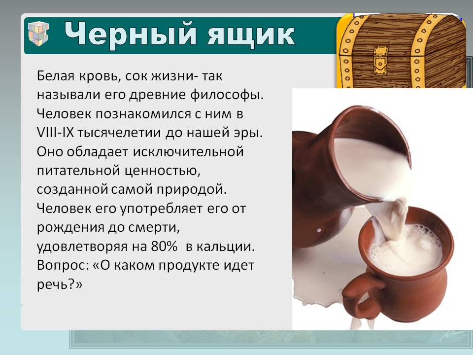 Белая кровь, сок жизни – так называли его древние философы. Человек познакомился с ним в VIII-IX тысячелетии до нашей эры. Оно обладает исключительной питательной ценностью, созданной самой природой. Человек употребляет его от рождения до смерти, удовлетворяя на 80% потребность в кальции. Вопрос: «О каком продукте идет речь?» (Молоко)