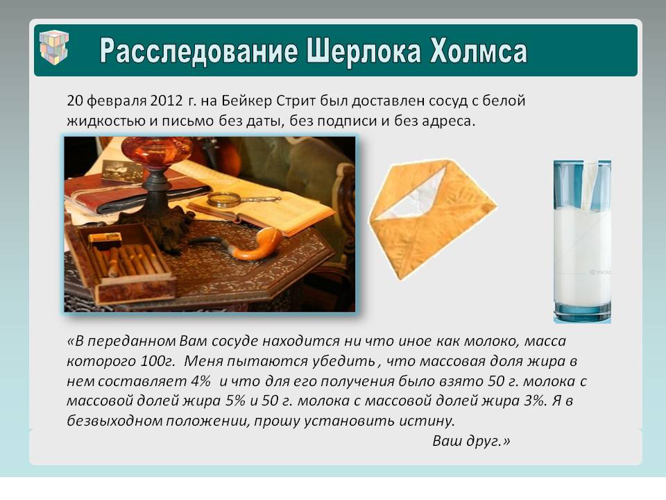 Учитель химии. Чтобы перейти к анализу молока Шерлок Холмс предлагает расшифровать перехваченную записку.
