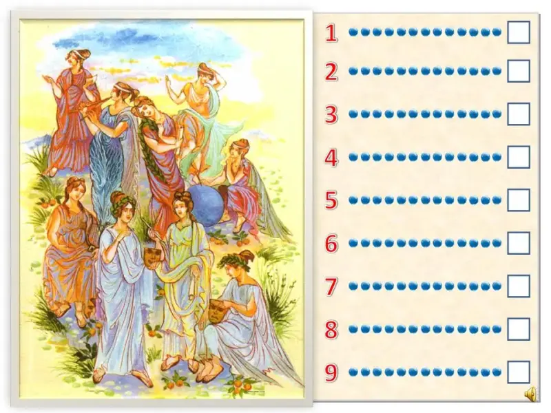 Наш первый урок музыки подходит к концу. Надеюсь, что теперь вы знаете о музыке гораздо больше, чем в начале урока. Приготовьтесь к испытанию "Девять вопросов от девяти муз".