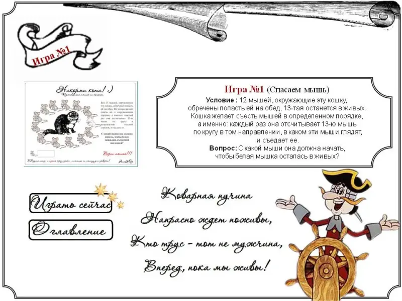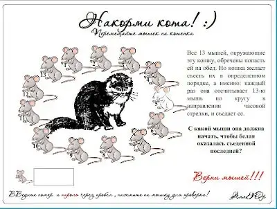 Условие задачи: Все 13 мышей, окружающие эту кошку, обречены попасть ей на обед. Но кошка желает съесть их в определенном порядке, а именно: каждый раз она отсчитывает 13-ю мышь по кругу в том направлении, в каком эти мыши глядят, и съедает ее.