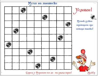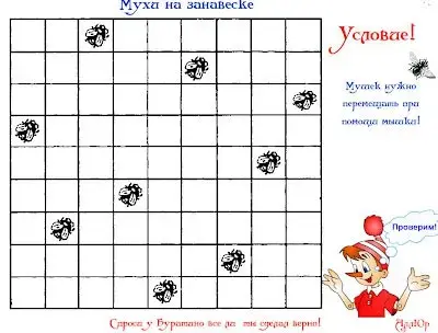 Условие задачи: На оконной занавеске, разрисованной квадратиками, уселось девять мух. Случайно они расположились так, что никакие две мухи не оказывались в одном и том же прямом или косом ряду. Спустя несколько минут три мухи переменили свое место и переползли в соседние, незанятые клетки; остальные шесть остались на местах. Но, хотя три мухи перешли на другие места, все девять снова оказались размещенными так, что никакая пара не находилась в одном прямом или косом ряду. Вопрос: Можете ли вы сказать, какие три мухи пересели и какие квадратики они избрали?
