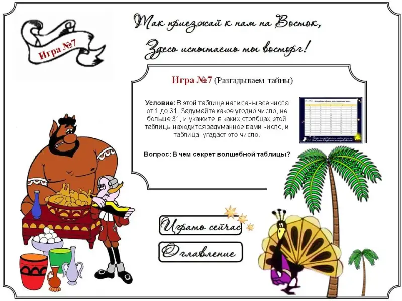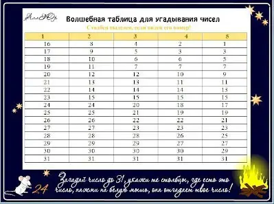 Задумайте, какое угодно число, не больше 31, укажите, в каких столбцах этой таблицы находится задуманное вами число, и таблица угадает это число.