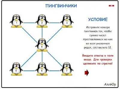 Расставьте пингвинов так, чтобы сумма чисел проставленных на пингвинах во всех указанных рядах, составляла 12.