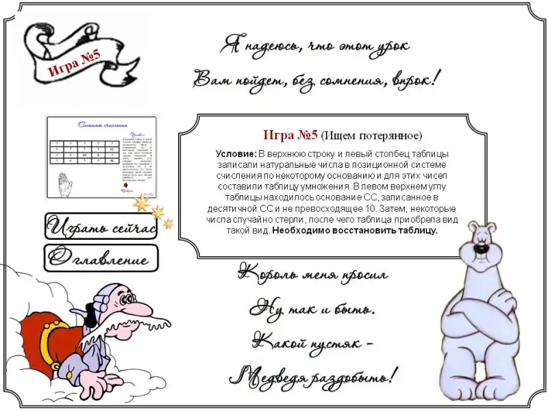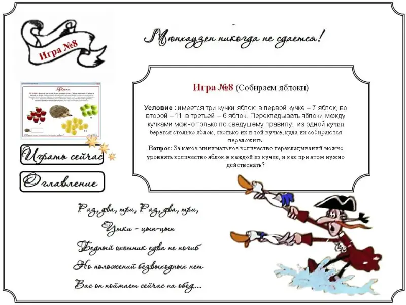 Я достаточно подробно остановилась на разборе задачи первого пособия, чтобы показать, как много всего интересного вытекает из такого забавного игрового начала урока