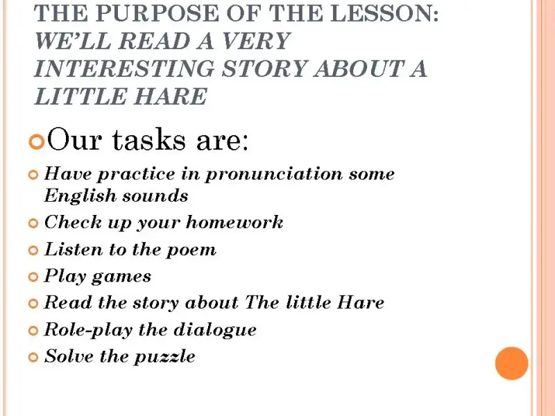 Well, today we'll read a very interesting story about a little hare. At the lesson we'll remember the words, we've studied before, read the text, play various games.