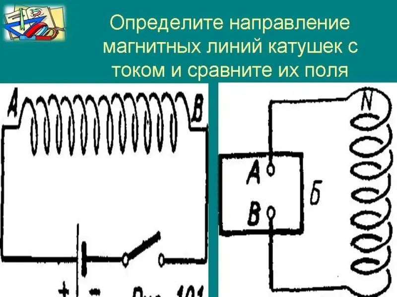 - Изобразите магнитные линии катушек с током, определите их направление и сравните поля этих катушек.