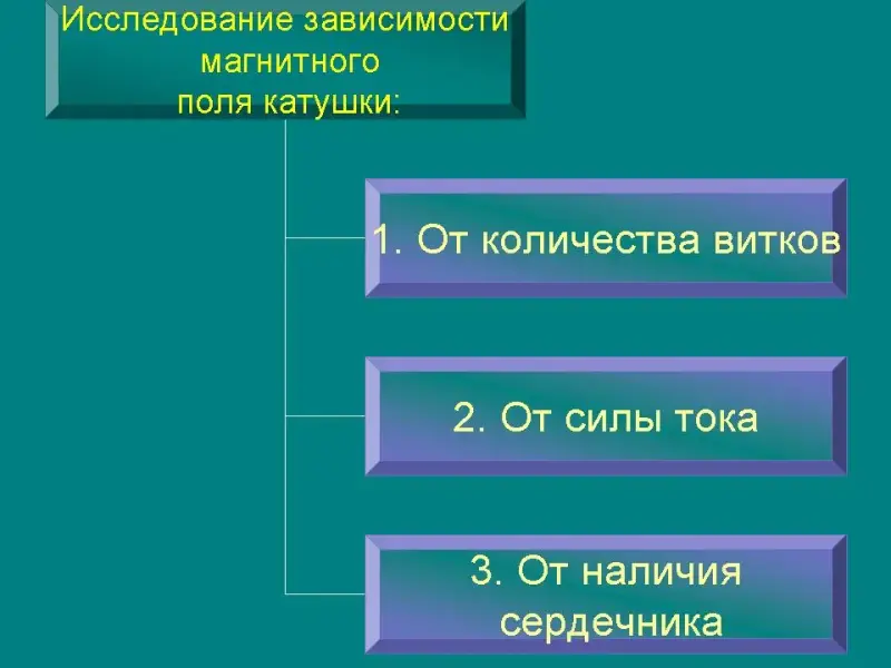- исследовать зависимость магнитного поля катушки с током от числа витков, от силы тока, от наличия сердечника в катушке;