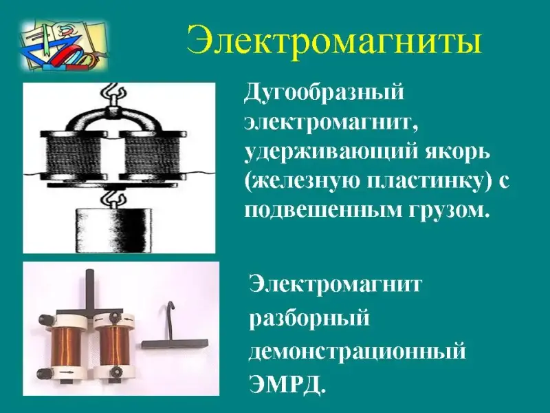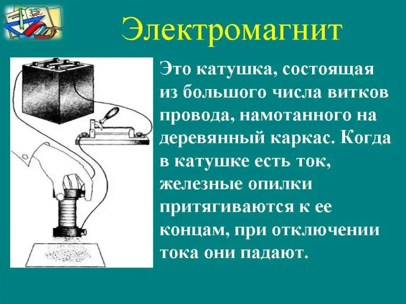 - При каком условии катушка притягивает к себе металлические предметы, то есть становится магнитом? (Когда по ней течет ток).
