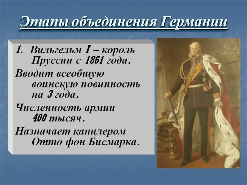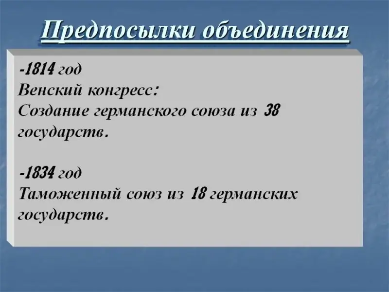 В первой половине XIX в. Германия оставалась раздробленной на множество государств. В каждом из них были своя политическая власть, армия, свои законы и таможня. Самыми значительными среди них были Австрия и Пруссия, претендовавшие на роль объединителя всех германских земель. (Слайды 2-3)