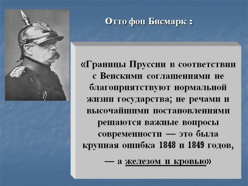 внешней политики: "Не на либерализм Пруссии взирает Германия, а на её мощь. Не речами, не постановлениями большинства решаются великие вопросы времени - это было ошибкой 1848 г., - а железом и