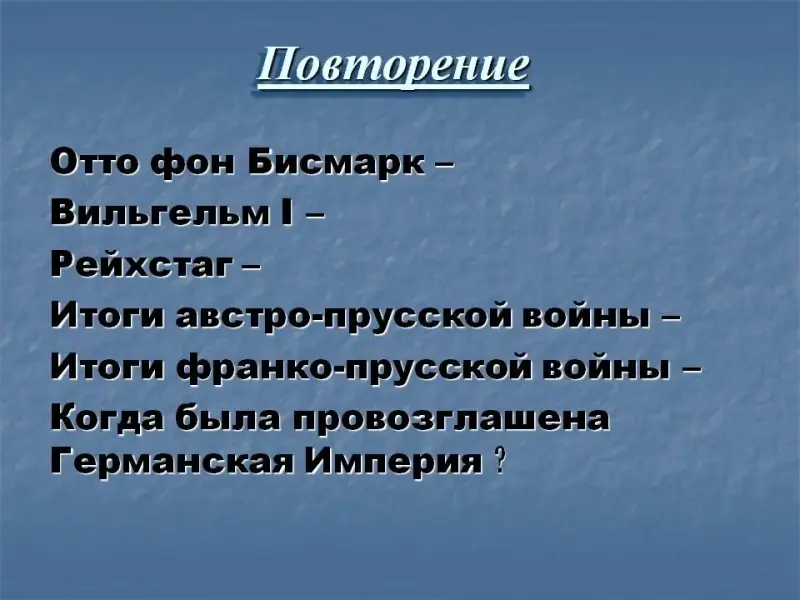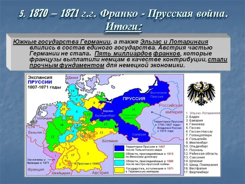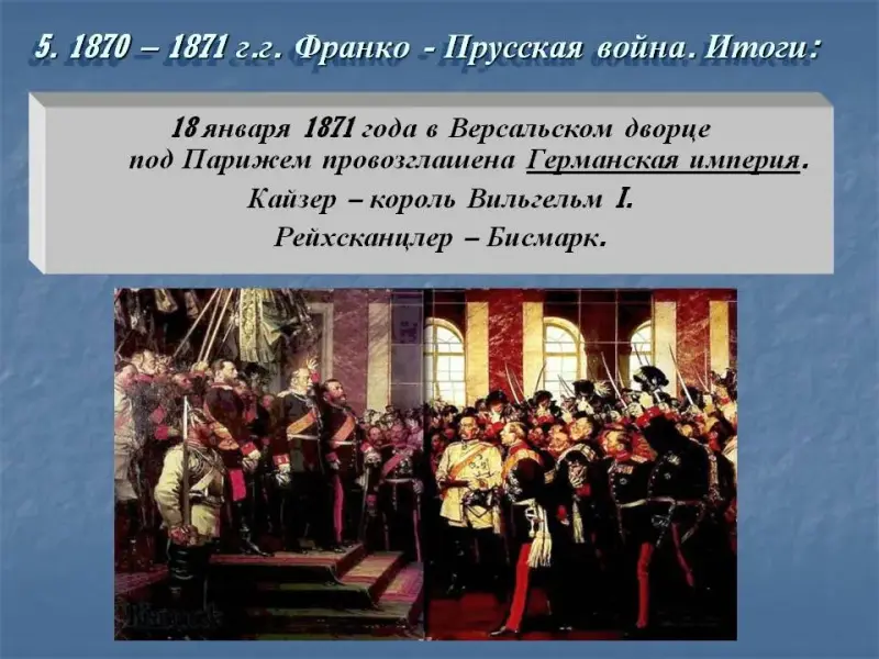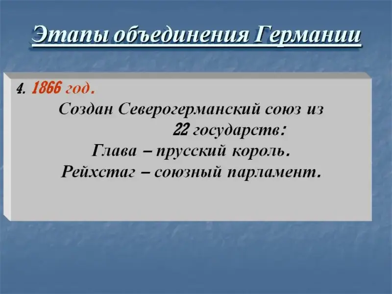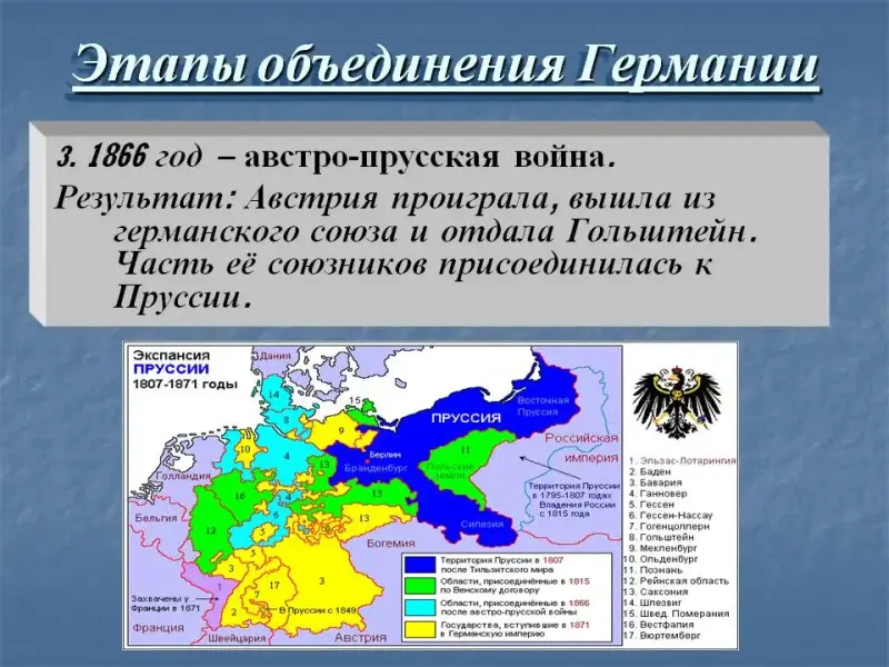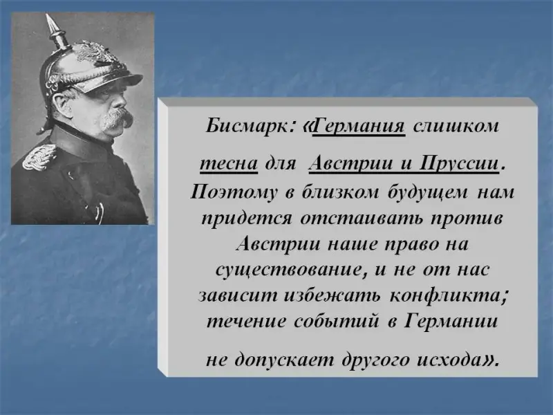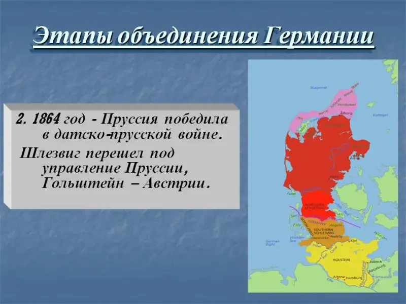 В 1864 г. Пруссия и Австрия вели войну против Дании, а в 1866 г. Пруссия вместе с Италией напала на бывшего союзника - Австрию. В результате поражения Австрия признала право Пруссии на создание