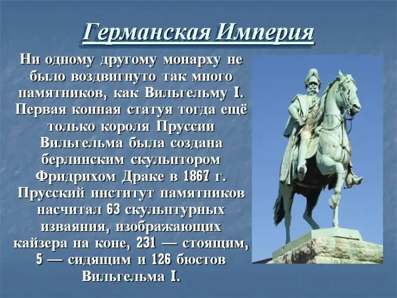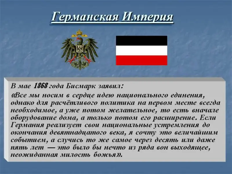 Германию создало Прусское государство. Истинным героем, с чьим именем связывалось рождение империи, был Бисмарк. Он и сам говорил: «Я всегда радовался, если мне удавалось, каким бы то ни было путем,
