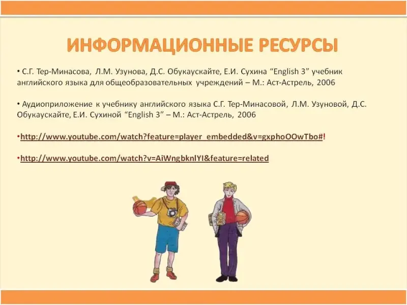 - С.Г. Тер-Минасова, Л.М. Узунова, Д.С. Обукаускайте, Е.И. Сухина "English 3" учебник английского языка для общеобразовательных учреждений - М.: Аст-Астрель, 2006
