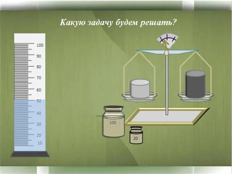 Учитель: (щелчок по слайду - появляется вопрос). Если мы определим объем тела и его массу, то какую задачу мы будем решать сегодня?