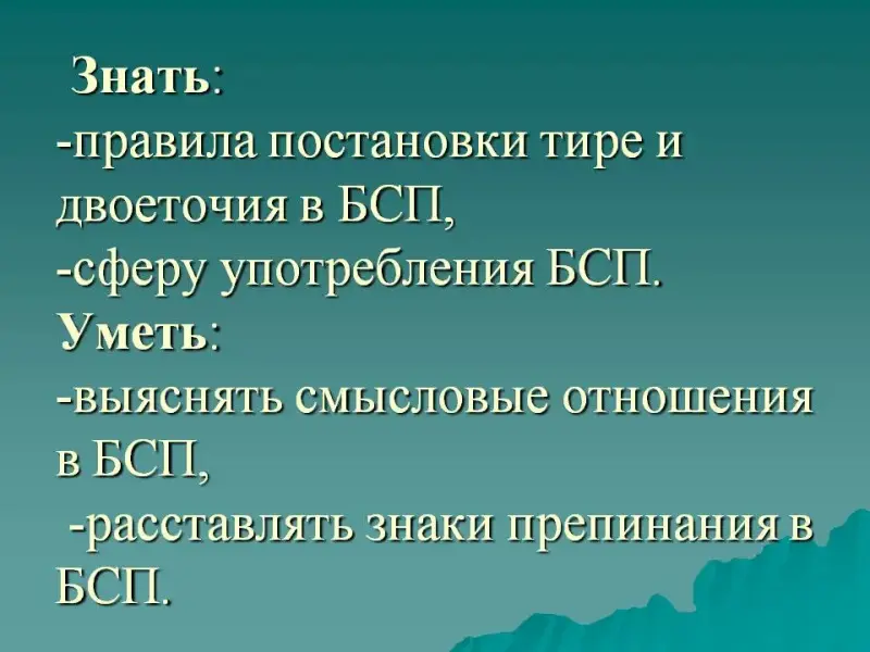 - уметь выяснять смысловые отношения в БСП, расставлять знаки препинания (слайд 2).