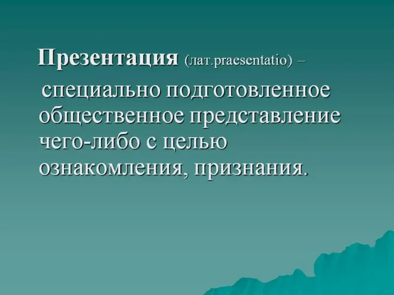 Презентация (лат. praesentatio) - специально подготовленное общественное представление чего-либо с целью ознакомления, признания.