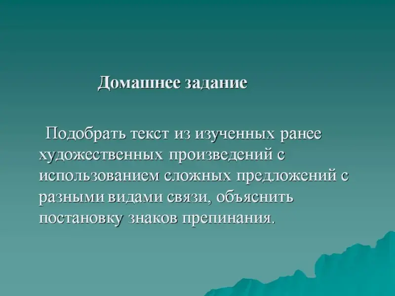 - Подобрать текст из произведений изученных авторов с использованием сложных предложений с разными видами связи, объяснить постановку знаков препинания.