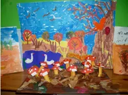 Цель: учить детей составлять осеннюю композицию, используя метод обрывания. Передавать краски осени, учить работать дружно в коллективе, помогая друг другу. - Конструирование: «Мухоморы».