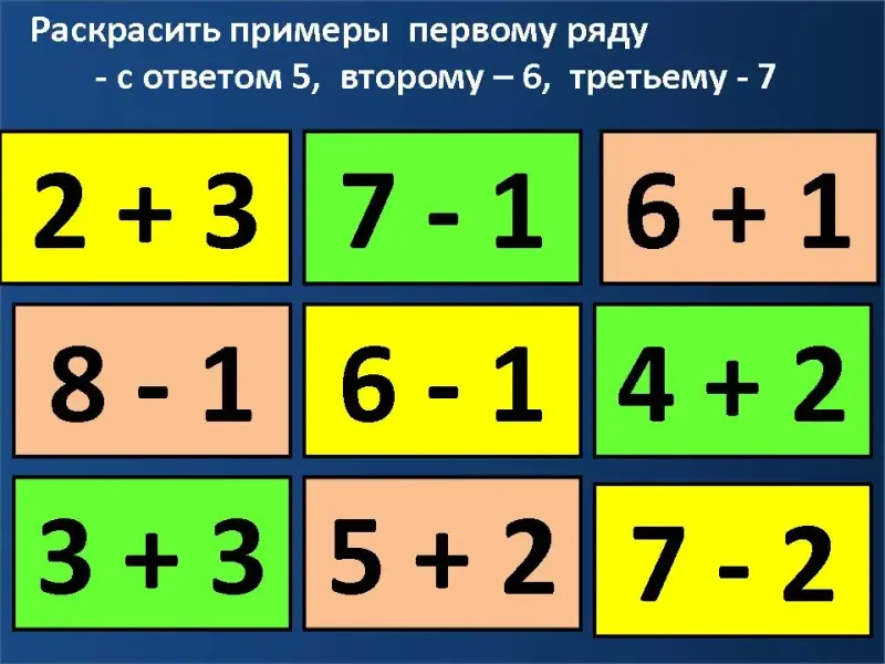 Змей Горыныч огнём дышит, каждая голова своё задание задаёт, очень трудное. Достал Иван-Царевич меч-кладенец и отправился на бой. А мы возьмём цветной карандаш и карточки белого цвета. Каждому ряду задание от головы: первому ряду раскрасить примеры с ответом 5, второму - 6, третьему - 7.