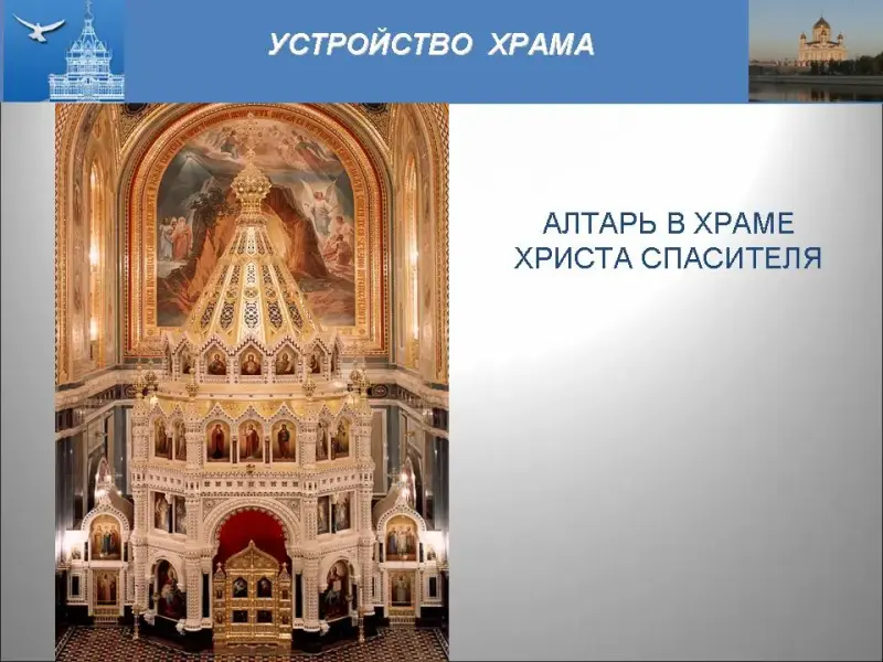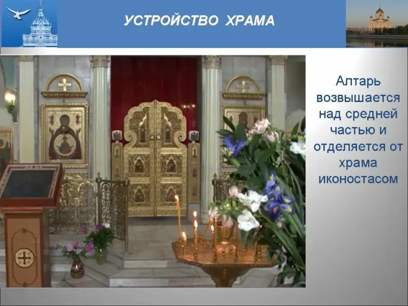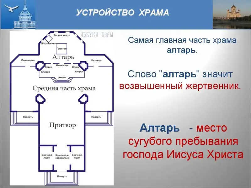 Главнейшая часть храма - это алтарь, место святое, поэтому в него не позволяется входить непосвященным. Алтарь означает небо, где обитает Бог, а храм - землю.