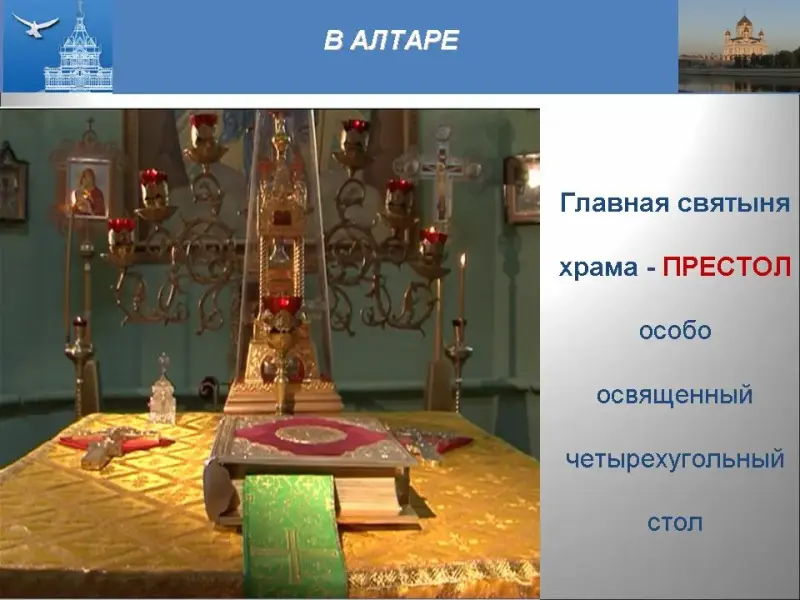 Главная святыня храма - ПРЕСТОЛ особо освященный четырехугольный стол, украшенный двумя материями: нижней - белою из полотна и верхней - из парчи. На престоле всегда находятся антиминс, напрестольное Евангелие, крест, дарохранительница, дароносица, возвышающийся посреди него.