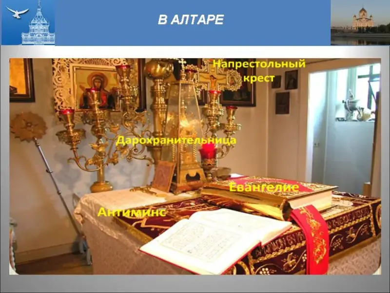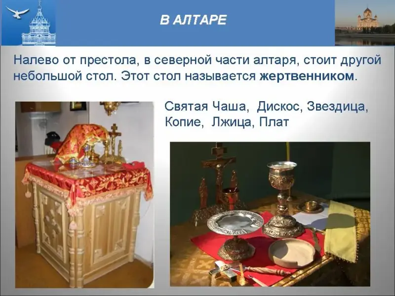 На алтаре, у северной стены поставлен особый стол, называемый жертвенником. Здесь готовятся хлеб и вино для причастия. Для их торжественного приготовления во время обряда (проскомидии) на жертвеннике находятся: потир - святая чаша, в которую вливается вино с водою (символ крови Христа); дискос - блюдо на подставке для причастного хлеба (символ тела Христа); звездица - две дуги, соединенные крестом, чтобы ставить их на дискос и покров не касался частиц просфор (звездица - символ звезды Вифлеемской); копие - острая палочка для вынимания частиц из просфор (символ копья, пронзившего Христа на кресте); лжица - ложечка для причащения верующих; губка для вытирания сосудов. Приготовленный хлеб для причастия накрывают покровом. Небольшие покровы называют покровцами, а самый большой - воздухом.