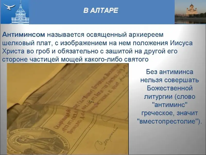Антиминс - главный священный предмет храма, освященный архиереем шелковый плат, с изображением на нем положения Иисуса Христа во гроб и обязательно с зашитой на другой его стороне частицей мощей какого-либо святого.
