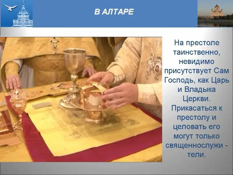 На престоле таинственно, невидимо присутствует cам Господь, как Царь и Владыка Церкви. Прикасаться к престолу и целовать его могут только священнослужители.