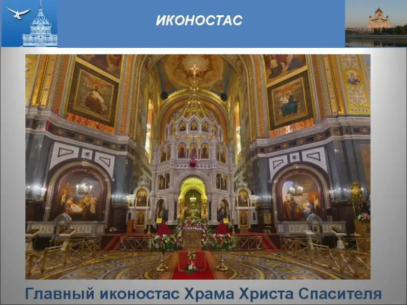 Если мы войдем в Храм Христа Спасителя через западные двери, то увидим, прежде всего, алтарь с иконостасом. Главный иконостас Храма - это восьмигранная часовня из белого мрамора, с орнаментом и инкрустацией цветными породами мрамора, сложнейшей резьбой по камню. В работе использован каррарский мрамор из Италии, отечественные камни лабрадорит, красный гранит, порфир, яшма.