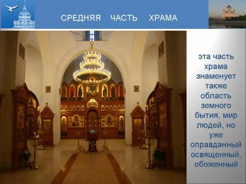 эта часть храма знаменует также область земного бытия, мир людей, но уже оправданный освященный, обоженый.
