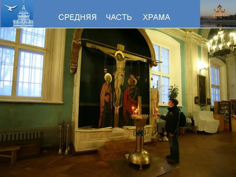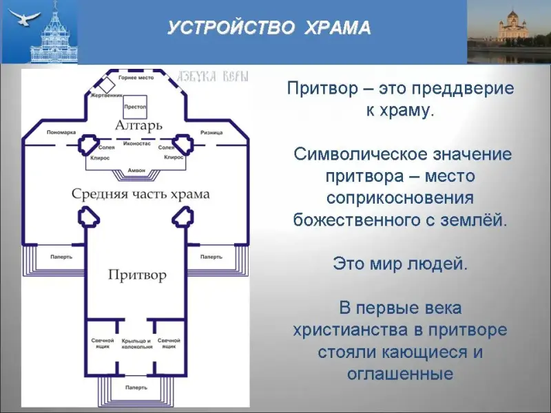 Православный храм делится на три части: притвор, сам храм (средняя часть) и алтарь.