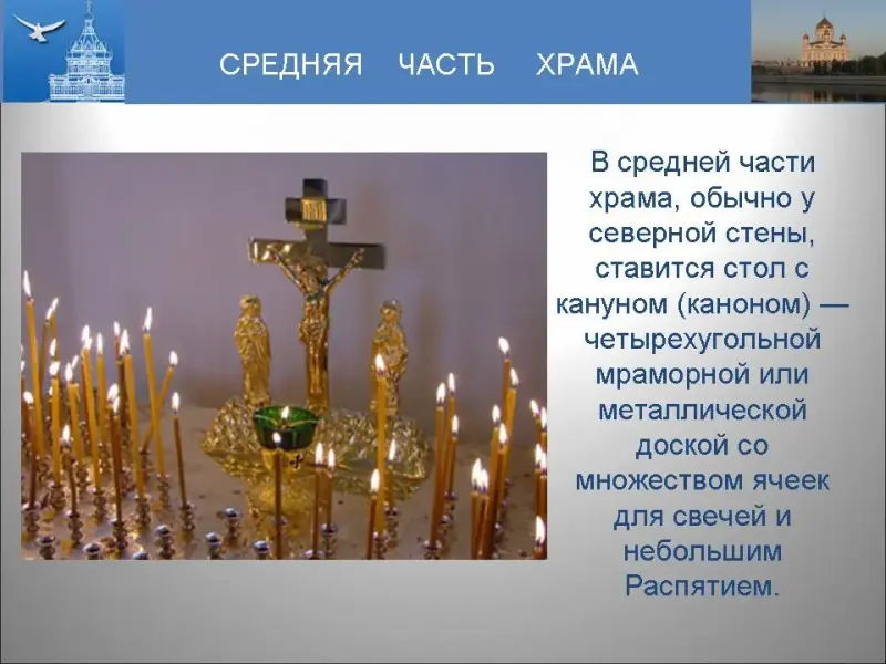 В средней части храма, обычно у северной стены, ставится стол с кануном (каноном) - четырехугольной мраморной или металлической доской со множеством ячеек для свечей и небольшим Распятием.