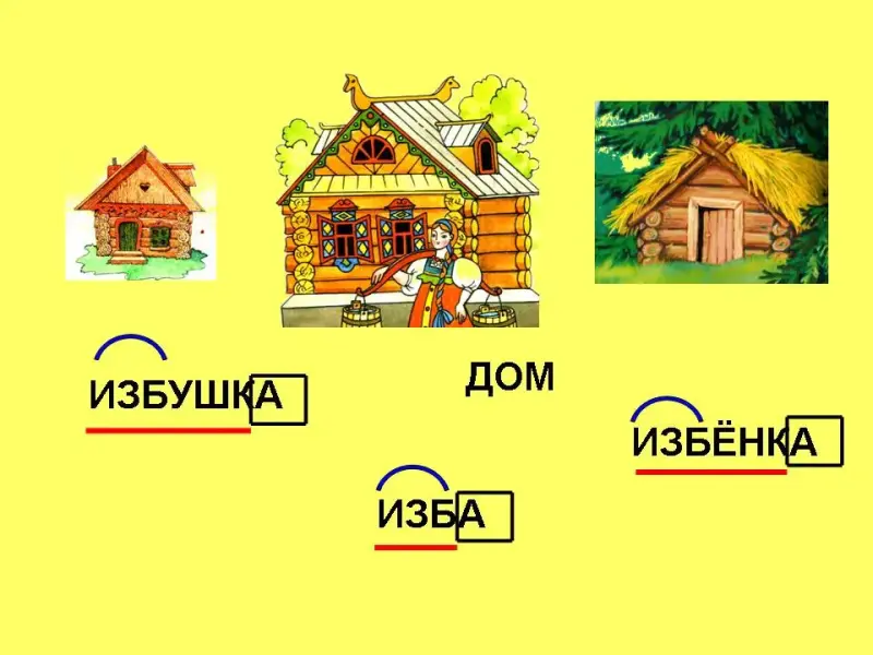 - Перед вами слова: избушка, дом, изба, избёнка. Какое слово «лишнее» в данном ряду? Почему? -Запишите в тетрадь слова: «изба, избушка, избёнка». Можно ли данные слова назвать родственными или это формы слова «изба»?