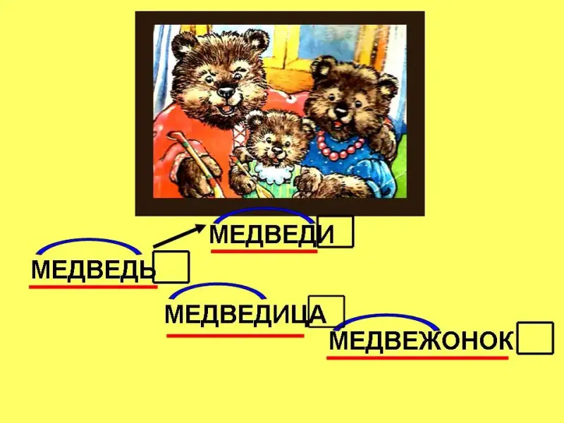 - Миша, поразмыслив, решил: Медведи - медведь, медведица, медвежонок - это одна семья, значит и слова из одной семьи, они родственные, у них общая значимая часть - медведь.