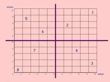 | «Важно - Не срочно» (правый нижний) | Здесь мы отмечаем долгосрочные перспективы и те цели, которые представляют для нас наибольшую ценность (личностное развитие, создание семьи, карьера, строительство дома и т.д.) |