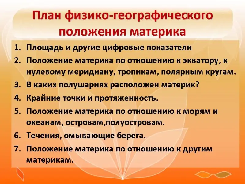 Учитель: Как и любое явление в географии, мы будем характеризовать географическое положение по плану. Слайд 4. . Этот план у вас на листочках на столах. Это опорный конспект. С которым мы и будем работать. В правую колонку будем записывать ответы.