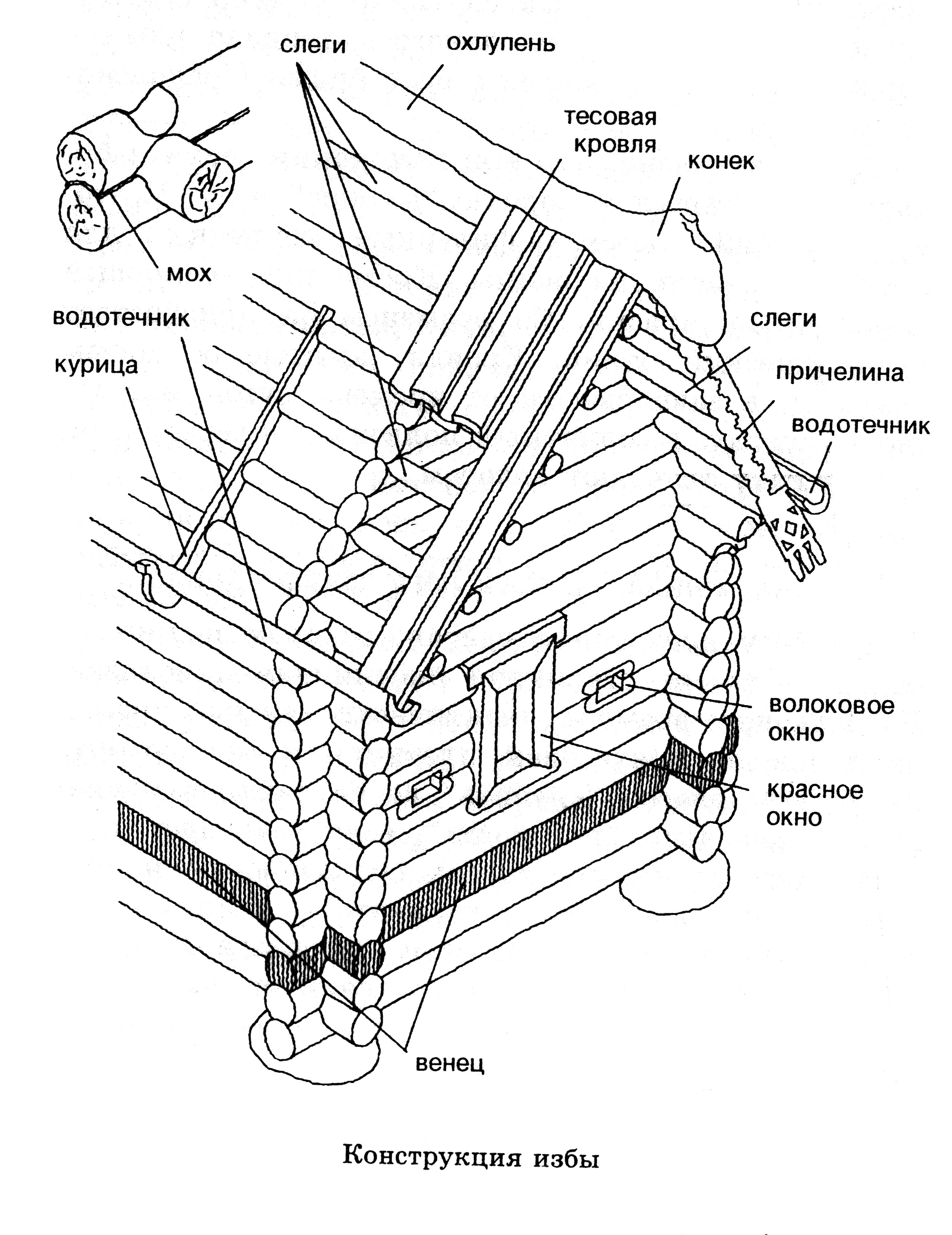 Дать понятие конь - охлупень, доски - полотенца, фронтон избы, доски- причелины, солярные знаки, наличники окон.
