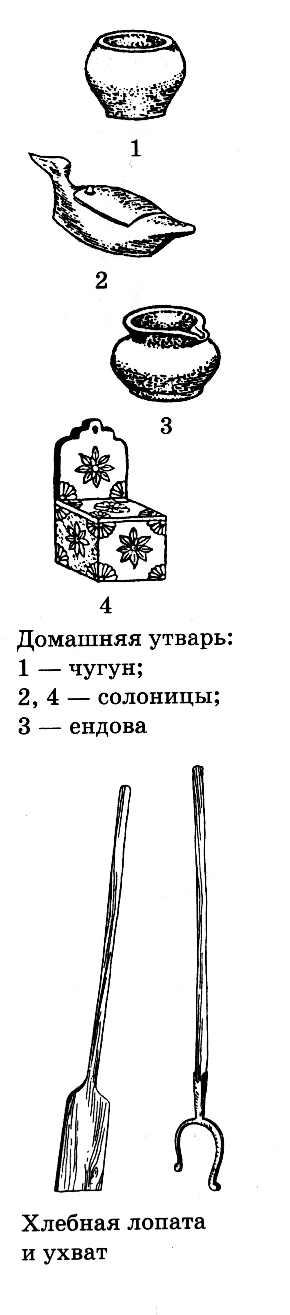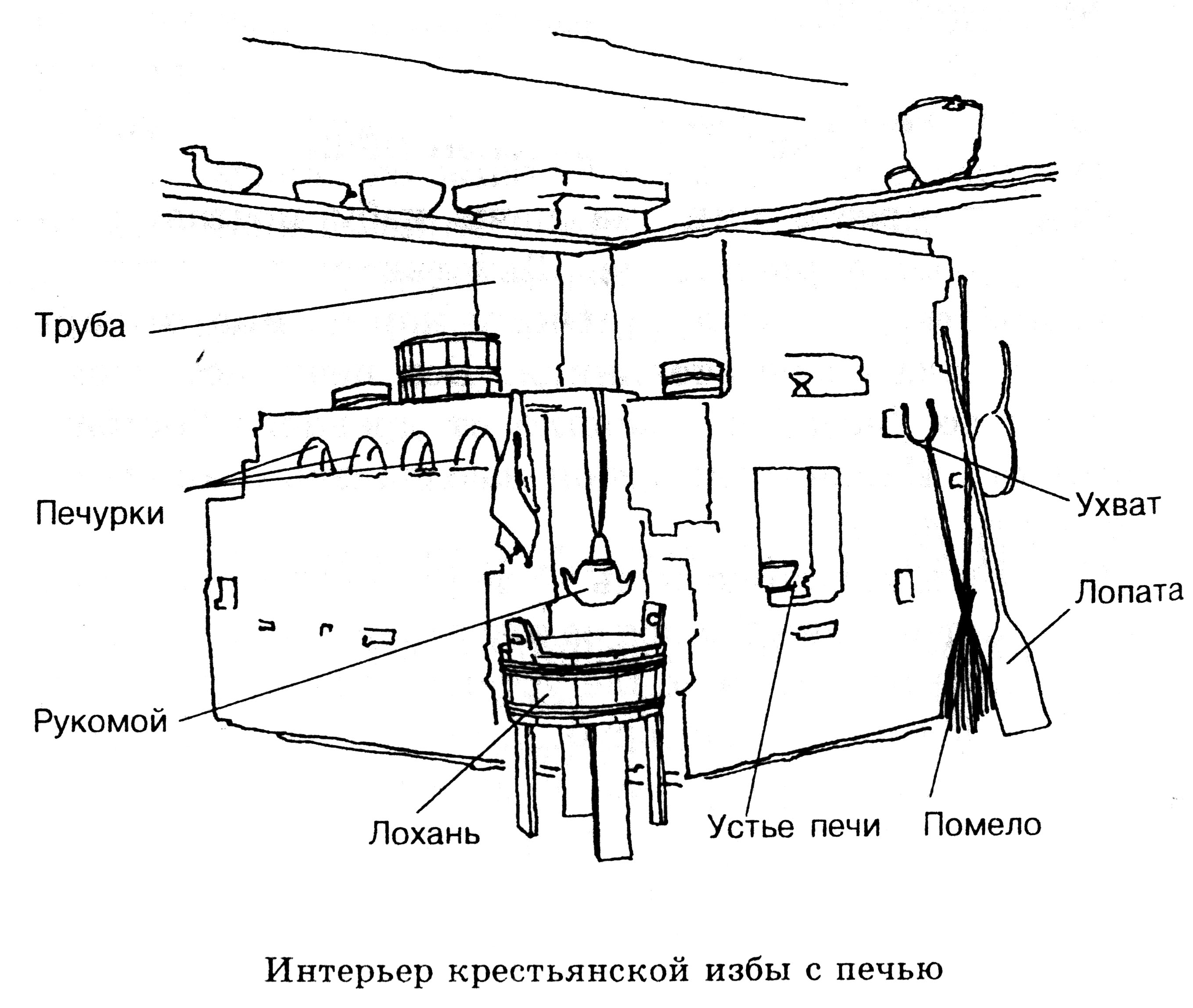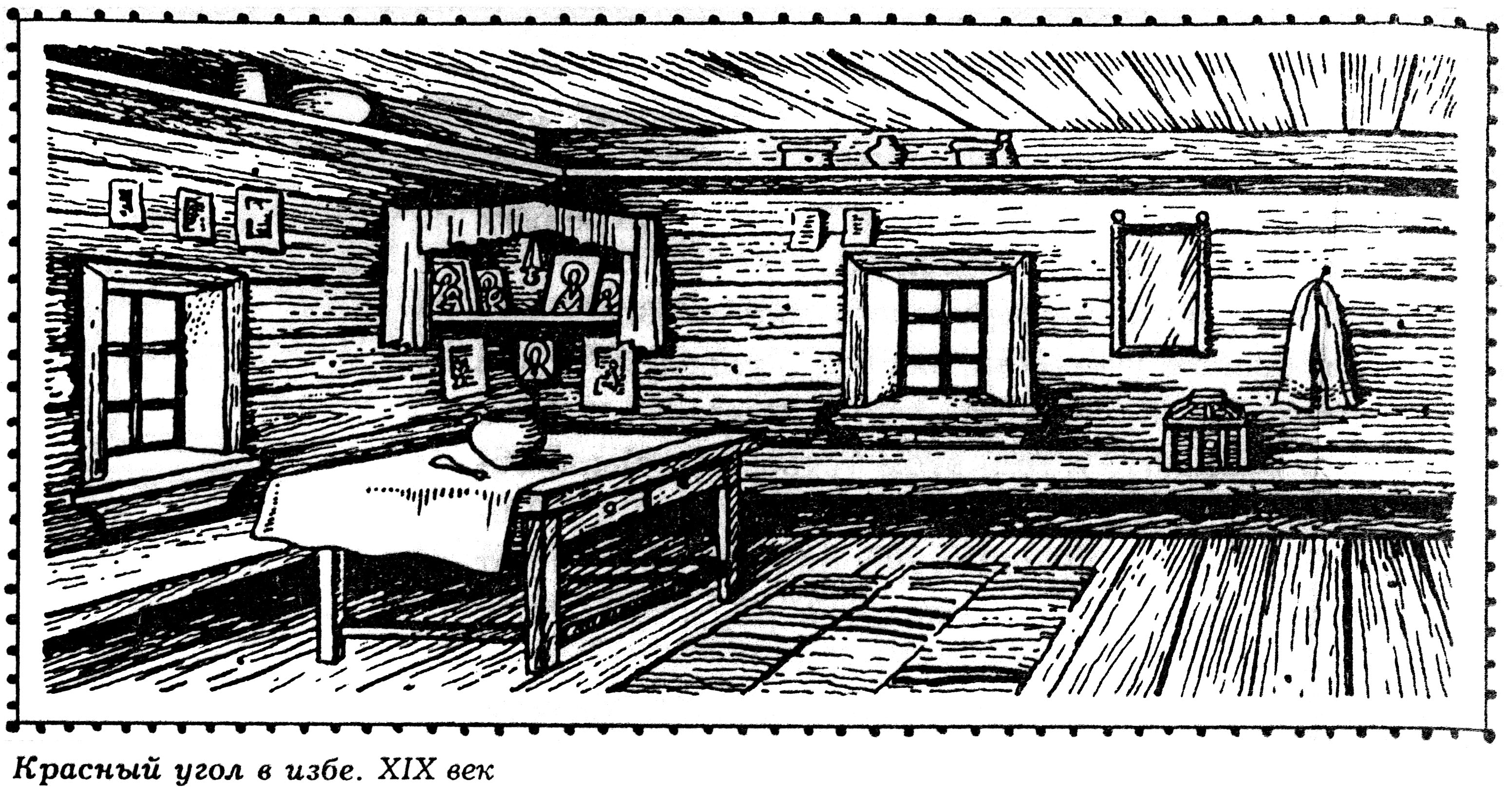 Интерьер избы - русская печь, красный угол. Предметы быта - ковши (конюх, скопкарь, черпак), чаши - ендова, хлебница, солонки, бураки, кузовки.