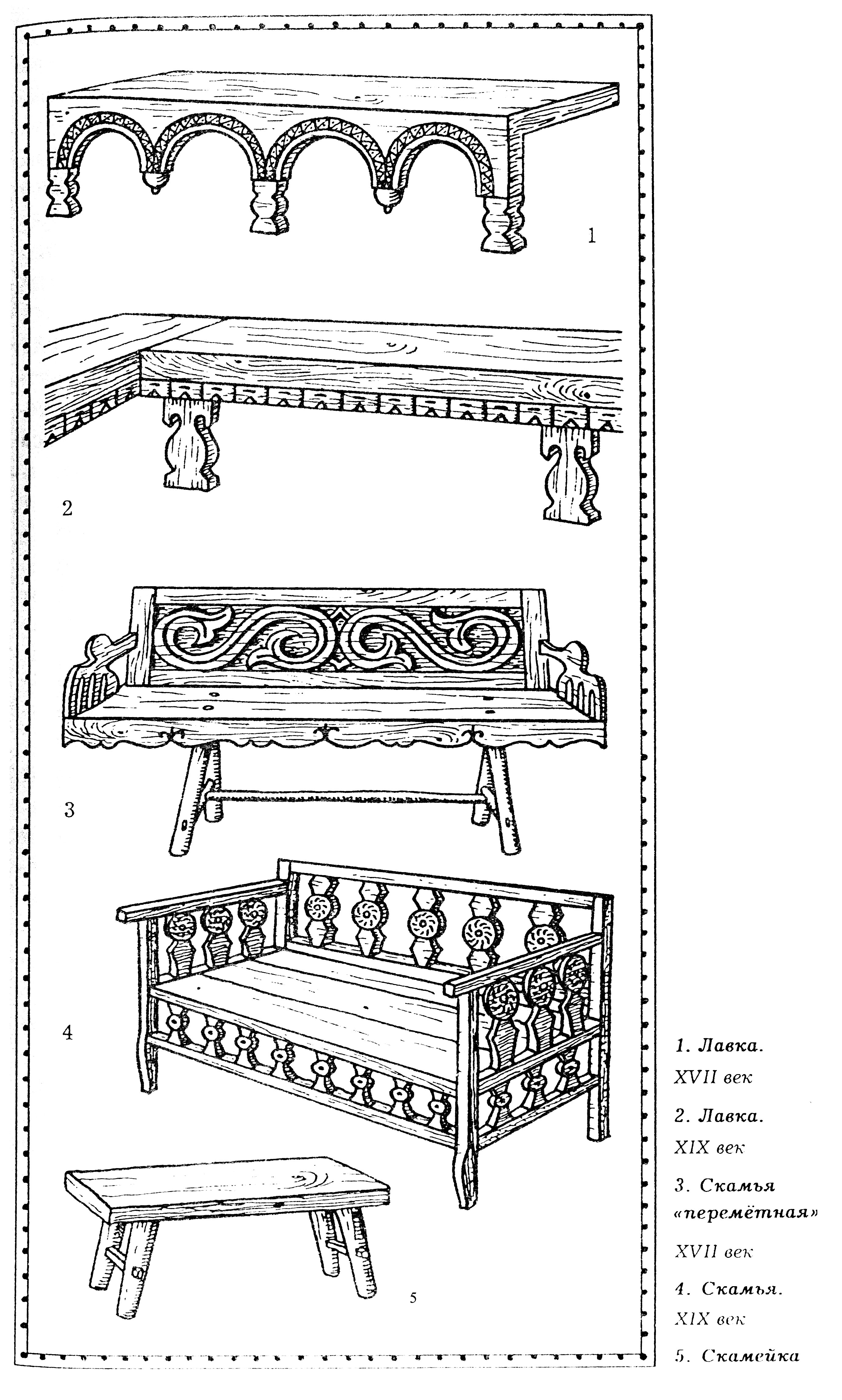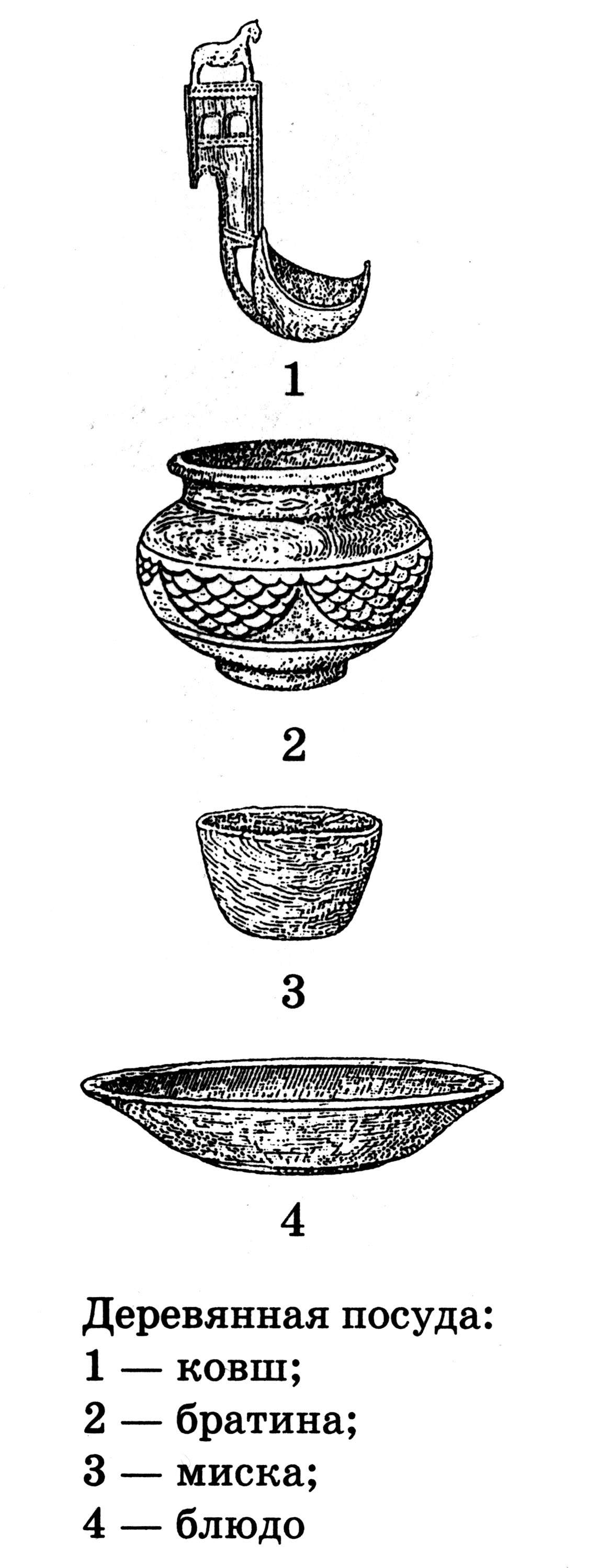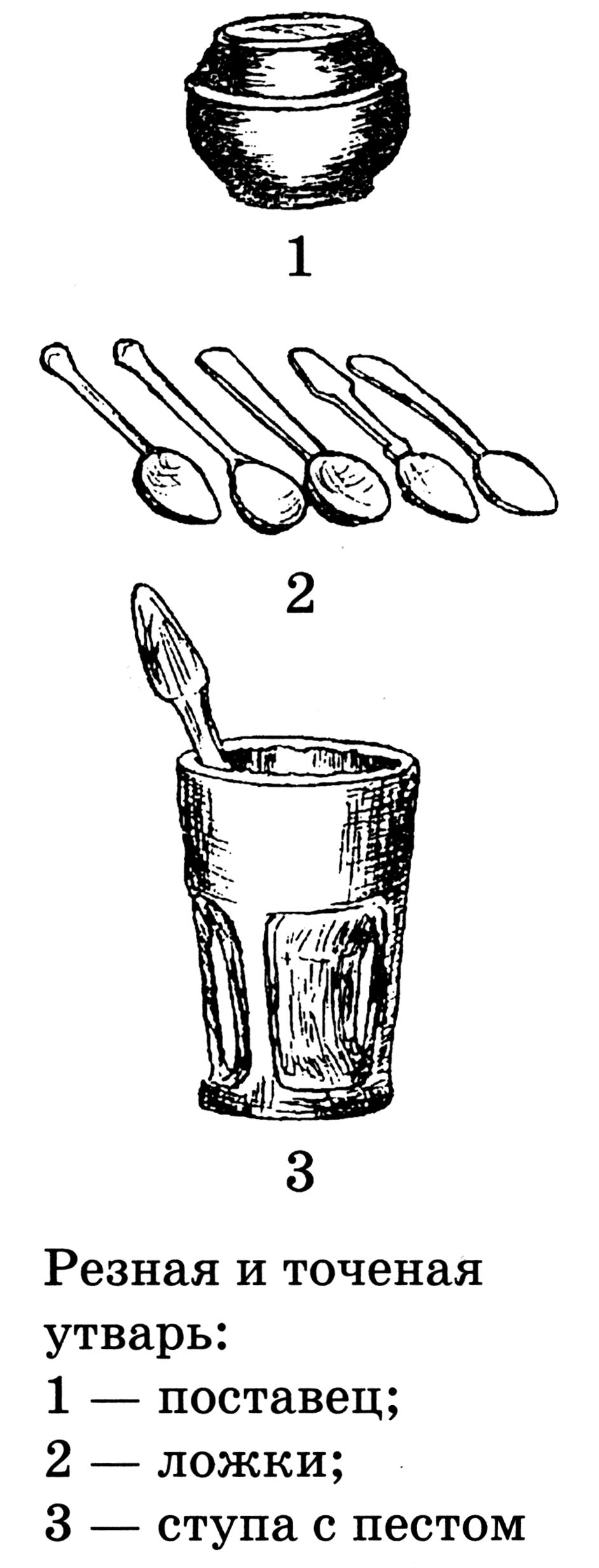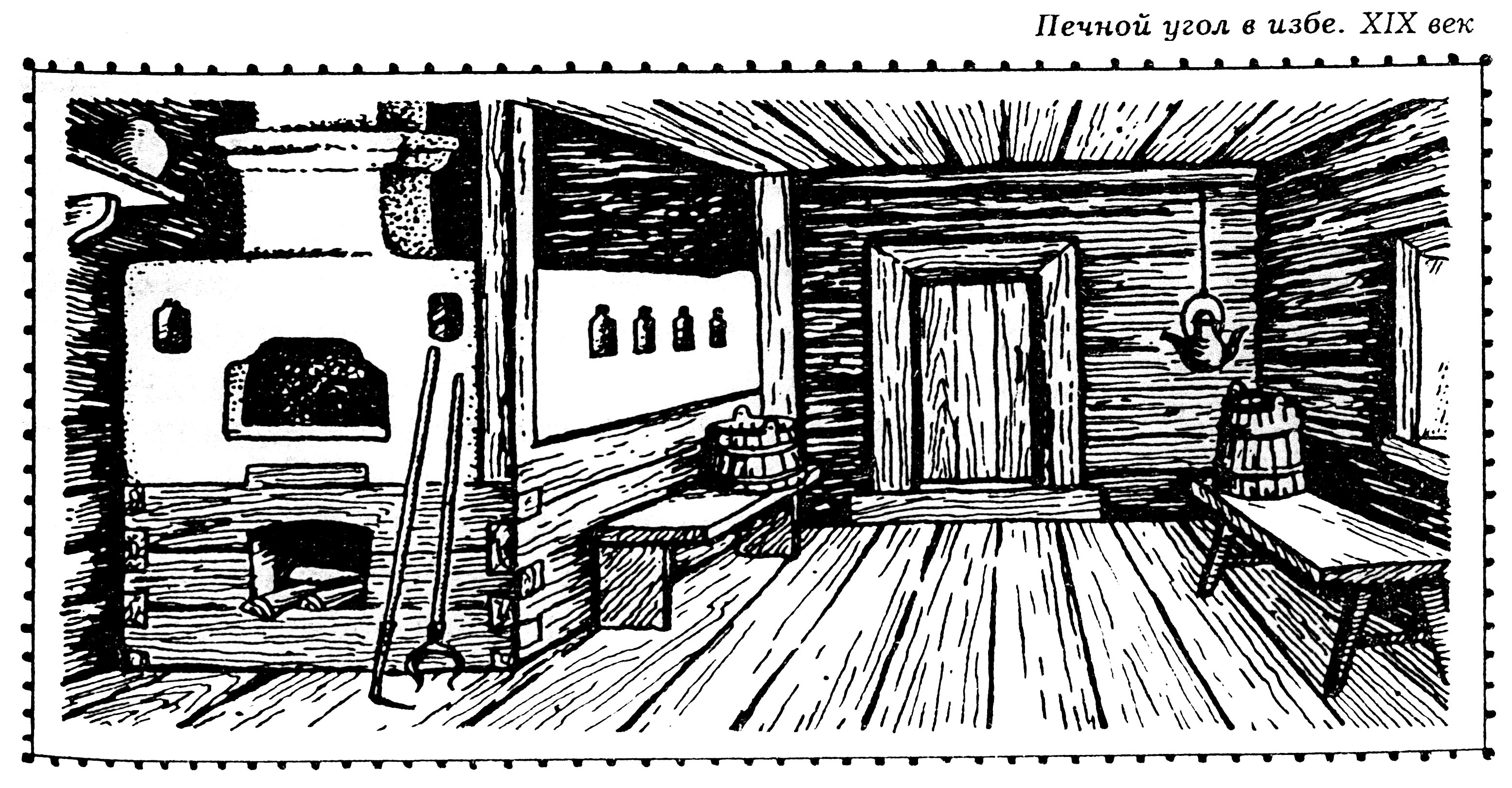 Интерьер избы - русская печь, красный угол. Предметы быта - ковши (конюх, скопкарь, черпак), чаши - ендова, хлебница, солонки, бураки, кузовки.