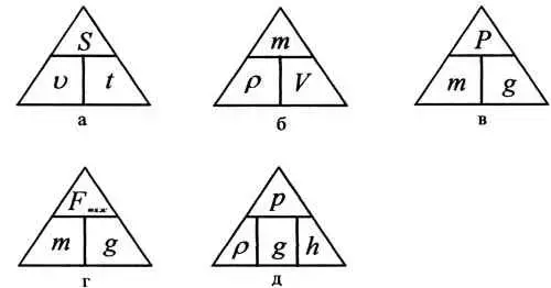 Для вычисления массы, зная ее объем и плотность, можно воспользоваться треугольником (б), в малый треугольник которого записано обозначение массы (m), а в трапециях -