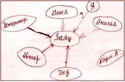 (Учащиеся доказывают словами из текста, как мальчик относился к Зайцу. рисуем кружок и пишем "Ваня" и от слова "Ваня" провожу к "Заяц" красную стрелку.)
