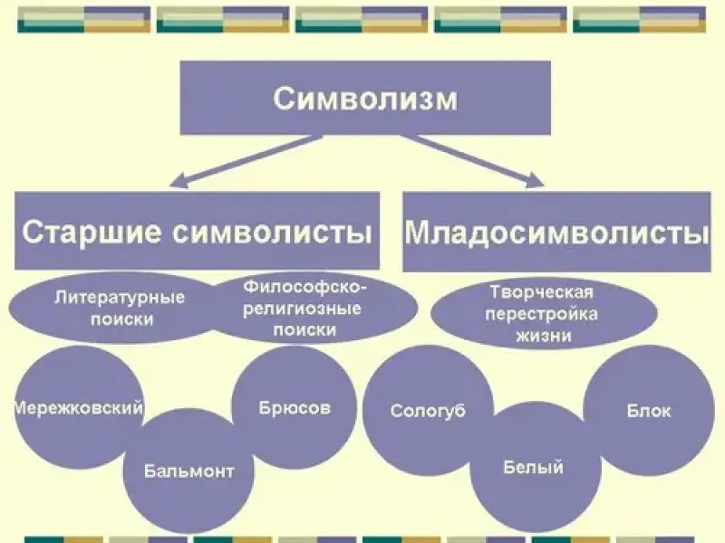 2). На какие группы разделились символисты? Назовите представителей каждой группы?