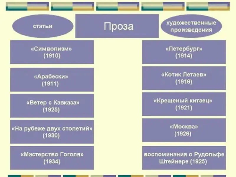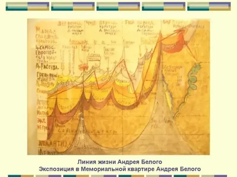 "Годами зари" назвал Белый начало 1900 г.г. В музее-квартире Белого представлена "Линия жизни" (Слайд 10) - оригинальная схема-диаграмма духовной биографии писателя, рисующая периоды творческих взлетов и падений с подробным указанием того, какие учения и идеи, а также какие люди оказывали на него влияние в разные годы. Она была им нарисована в 1927 году.