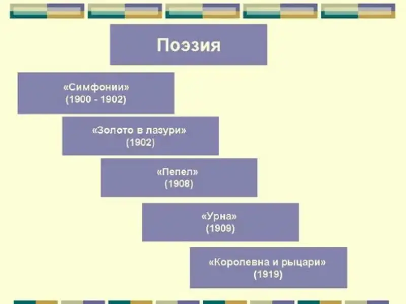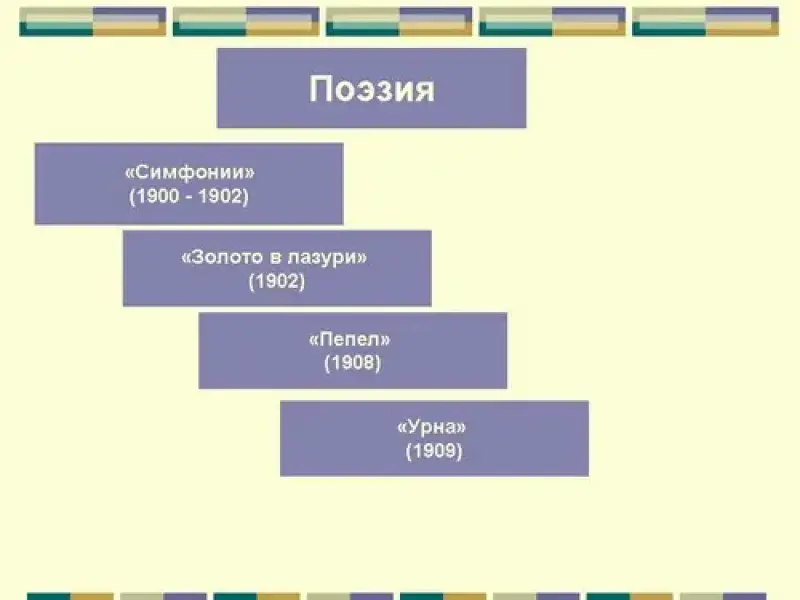 4). Поэзия. В 1904 году выходит первый сборник стихов "Золото в лазури" (Слайд 11), предметом поклонения Белого становится солнце: "Солнцем сердце зажжено. Солнце к вечному стремительность. Солнце - вечное окно В золотую ослепительность". Посвящено это стихотворение Константину Бальмонту, автору книги "Будем как солнце", вдохновившей Белого на создание цикла, который открывает сборник. Миф о золотом руне Белый преобразует в символическое иносказание о жизненных целях своего поколения рубежа столетий. В стихотворениях цикла выражена программа "аргонавтов". В сборнике будущее выступает в обличьях, масках старины ("Старина в пламенеющий час, обуявшая нас мировым..."), прежнего счастья, образов прежней культуры. В кульминационной части "Багряница в терниях" в центре - образ распятия. В Христе видит Белый возрождение мира. Вокруг Солнца - образы дорогих поэту людей - отца и Соловьевых, и даже сам он себя видит распятым на кресте. В этом сборнике звучит его отрицание жизни ("Жизнь мрачна и печальна, как гроб"), слово озлобленно и презрительно.