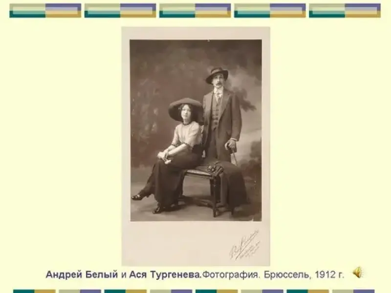 Духовному возрождению Белого способствовало сближение в 1909-1910 с начинающей художницей Анной Алексеевной Тургеневой (Асей), которая становится его фактической женой [гражданский брак оформлен в Берне (Швейцария) 23 марта 1914]. Прослушивание звукового файла "Белый. Асе".Читает Шевченко. ( Слайд 15).