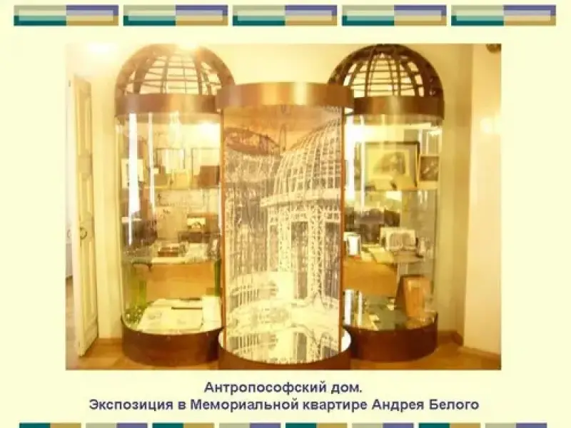 7). Занятия антропософией. В апреле-мае 1912 Белый с женой живет в Брюсселе, в мае 1912 в Кёльне они встречаются с Р. Штейнером - создателем антропософского религиозно-мистического учения - и становятся его приверженцами. В антропософии Белый видит системное воплощение духовных идеалов, достижение искомой гармонии между мистическим и научным познанием. С марта 1914 до августа 1916 Белый в основном находится в Дорнахе, близ Базеля (либо в соседнем Арлесгейме), где участвует под руководством Штейнера в строительстве антропософского центра - "храма-театра" Гетеанума. (Слайд 17). Занятия антропософией (и связанной с ней проблемой внутреннего самопознания человека) поощряют углубленное внимание Белого к автобиографической теме. С октября 1915 по октябрь 1916 он пишет роман "Котик Летаев", в котором воскрешены и осмыслены его собственные младенческие переживания, первые восприятия мира. Роман должен был начать серию автобиографических произведений (впоследствии продолжен романом "Крещеный китаец" 1921).